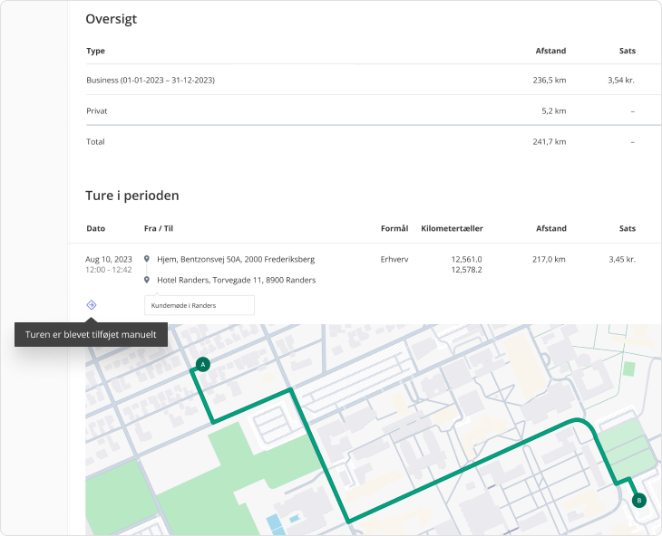 Automatisk tracking sikrer, at alle ture bliver registreret præcist. Manuelt tilføjede ture markeres og vises på kort, så du nemt kan tjekke og undgå fejl i rapporterne – før de når budgettet.